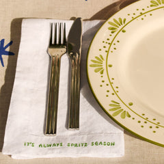 The homeware pieces are handpicked to elevate your table. Arkitaip’s linen napkins are embroidered with playful, spritz-inspired mantras to spark conversation, while Joanna Ling’s hand-crafted ceramic candleholders echo the delicate floral silhouette of elderflower, adding a subtle, artistic touch. Pygmalion London’s hand-poured dinner candles provide a warm, inviting glow, completing a table setting that feels both thoughtful and refined.
